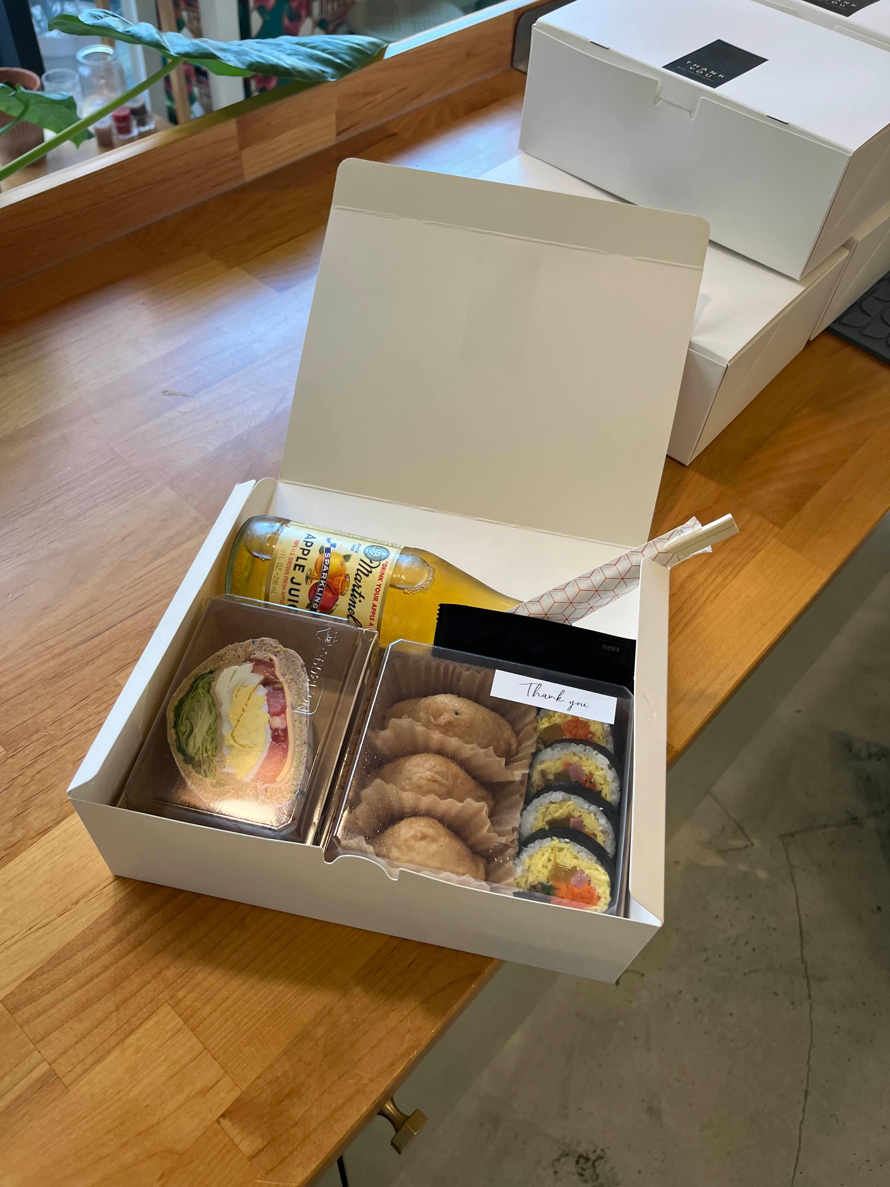 박스도시락은 간식형 도시락과 음료를 1인 포장박스에 담아 정성스럽게 대접할 수 있는 고급 답례 도시락이에요.